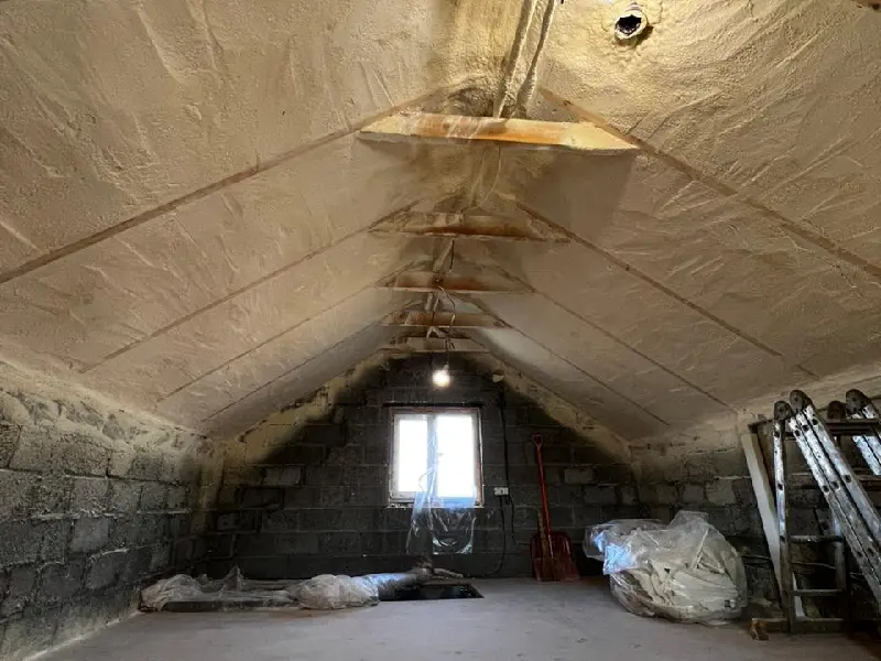 Напыление начинать с труднодоступных мест: фронтоны, дымовые трубы, вентиляционные отверстия и т.п.